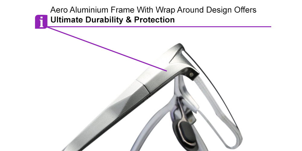 These glasses are gracefully slender yet obstinately tough, thanks to their aero-aluminum impact resistant frame.